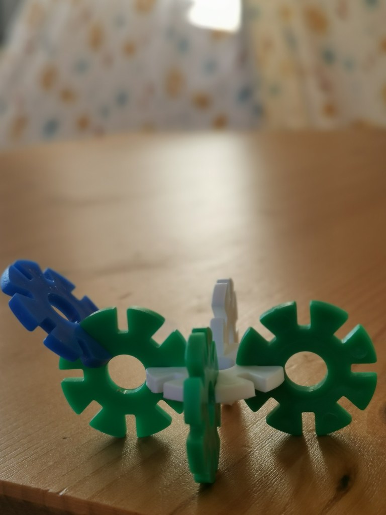 I was pretty upset about the train, too. While I’d hoped it would allow for a short reprieve, I was now chasing it from under the furniture, feeling increasingly annoyed. Eventually Finn lost interest and ran off. A few minutes later he came back with his box of STECKIs (this is not an ad for them, I don’t get paid for mentioning them). STECKIs are a motor skill building toy, the one you see in the top picture. From those, we built a flying motorbike with a light (which is also the top picture). I guess you can see it with lots of imagination. Next I knew, he was playing with it for a long period of time, just a bunch of STECKIs put together. Nothing automatic, not even something concrete, just his imagination at work.